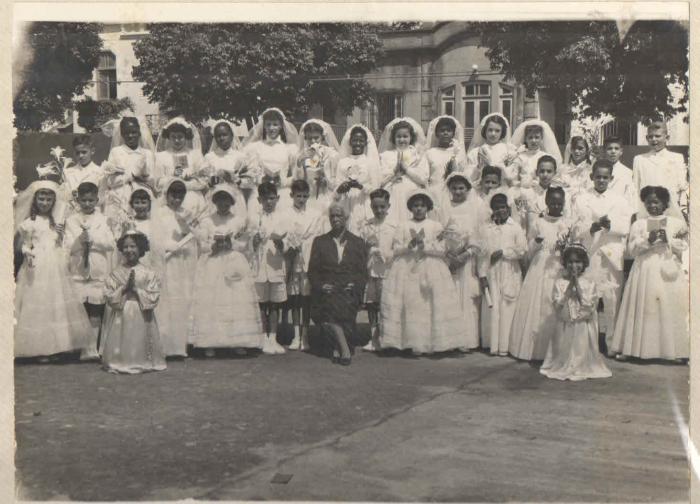 Sim, é a foto da primeira comunhão, com os alunos de nossa turma, a 3ª série primária. Na época a escola era uma escola primária indo da 1ª a 5ª série. Com um só professor por turma, sendo normal um professor acompanhar a turma não sendo possÃvel para Dª Francisca ser nossa mestra em 1955 devido a sua licença para maternidade pelo nascimento de sua primeira filha. Lembro que fomos preparados para a Comunhão pela tia de um colega, pois a mesma fazia a catequese na Igreja Cristo Rei (atual Igreja do Sagrado Coração, que fica na rua Carolina Santos esquina com rua Carijós ). O nome dele se não me falha a memória era Antonio Plauto. Meu irmão que nessa época cursava a 1ª série também fez a comunhão nesse dia. Era primeira comunhão para todos os alunos da Escola. Fiquei muito feliz de ter recebido a Eucaristia.